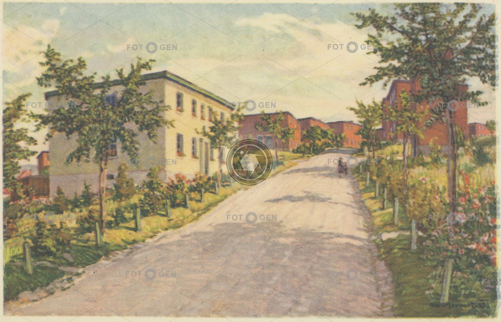 art Aug. Mervart barevná Baťa houses baťovské baťovy domky celkový color colored čtvrtdomek drawing Gottwaldov kolorovaná kresba Letná malba malíř místopis obytné čtvrti painting topography umění Zlín