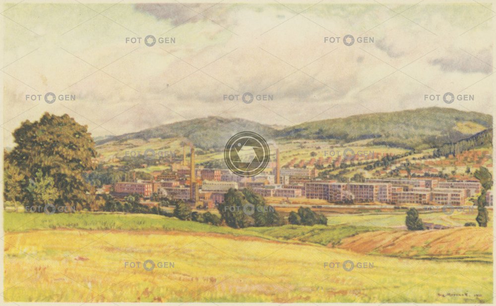art Aug. Mervart barevná Baťa Baťa factory Baťovy závody celkový color colored drawing education Gottwaldov Jan Antonín Baťa kolorovaná kresba malba malíř Masarykovy školy Mervart místopis painting panorama school Svit škola školství Tomáš Baťa topography továrna umění Zlín živnostenská živnostenské