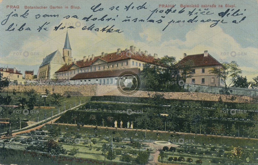 1. lékařská fakulta 1916 Alžbětinek barevná botanic garden botanická color colored gardens hospital church Kirche kolorovaná kostel místopis Na Slupi nemocnice nemocnie New Town Nové Město Podskalí Prague Praha Sexuologický ústav sv. Alžběty sv. Apolináře topography Univerzita Karlova zahrada