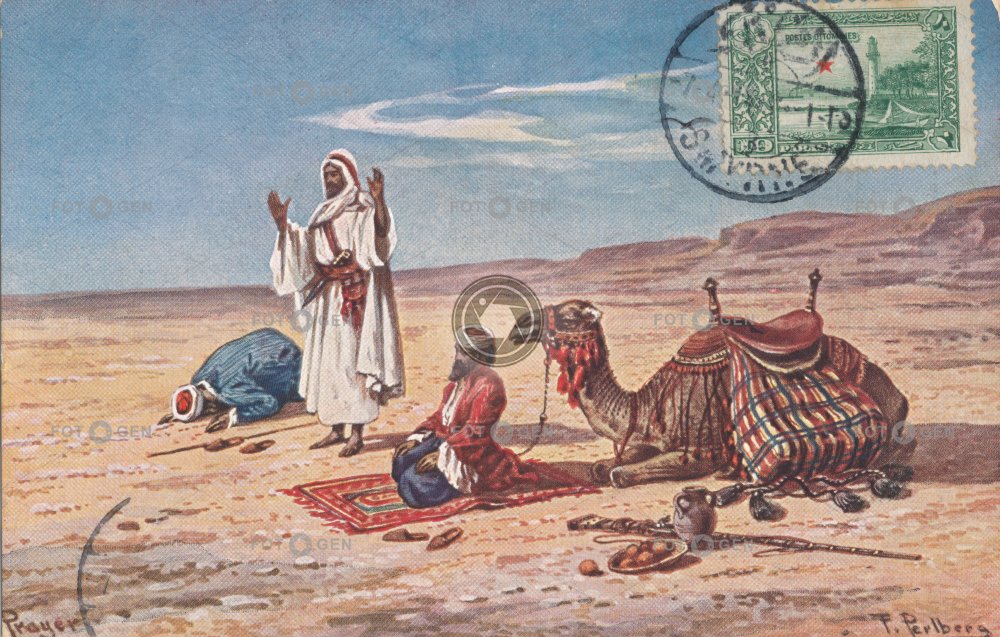 arab arabové Arabs barevná camel clothes color desert ethnology etnologie kresba kroj malba man mann místopis modlitba muž oblečení orient orientální poušť prayer rogation saddle sedlo Syria Sýrie topography velbloud