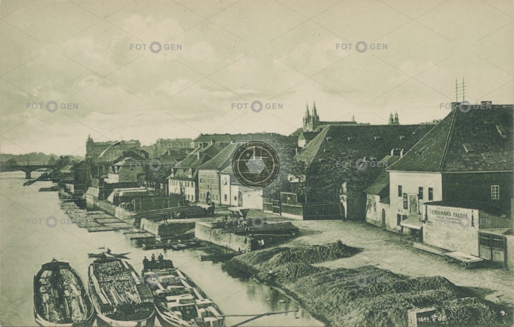 břeh cargo ship colored dřevo embankment kameníci kolorovaná loď loďky místopis nábřeží nákladní neexistující stavba nonexistent building old Palackého palivové Písek Podskalí Prague Praha Rašínovo river řeka sand stonemasons topography Vltava wood