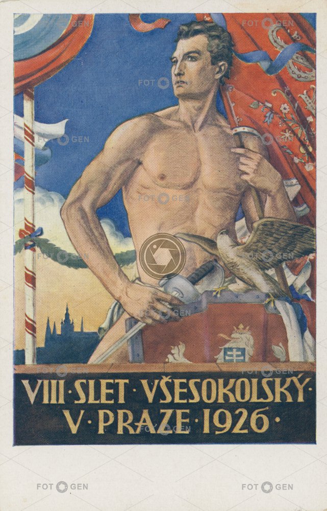 1926 art artist barevná color colored drawing event flag Hiršla kolorovaná kresba malba malíř místopis painter painting Prague Praha prapor sokol sokolovna topography událost umění