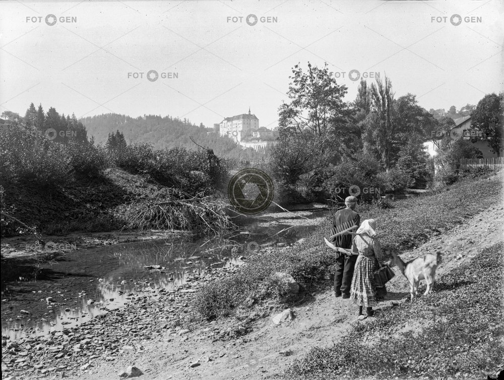 břeh castle costume couple Český Šternberk dvojice goat hrabě hrad koza kroj peasant práce pracovní oděv rake river rMístopis rolník řeka Sázava shore topography work work clothes