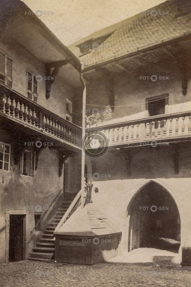 Albrecht of Wallenstein Albrecht z Valdštejna backyard dvorek Eger Gothic gotika Cheb městský dům místopis museum muzeum Pachelbel 's house Pachelbelův dům pavlač porch portál railings schody stairs topography town house Wallenstein zábradlí