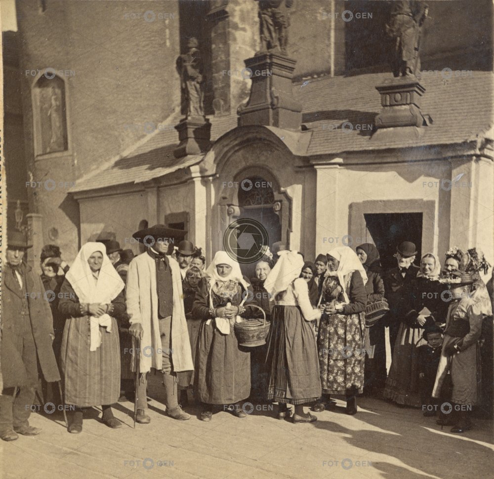 Chodové v krojích v neděli před kostelem, polovina stereofotografie Autor: František Krátký