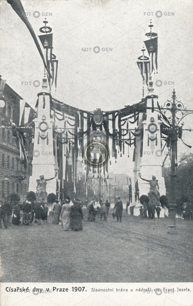 1900-1909 1907 brána celebration event feast Feier flag gate lidé Menschen místopis New Town Nové Město oslava people Prague Praha slavnosti slavnostní symbol topography událost vlajka
