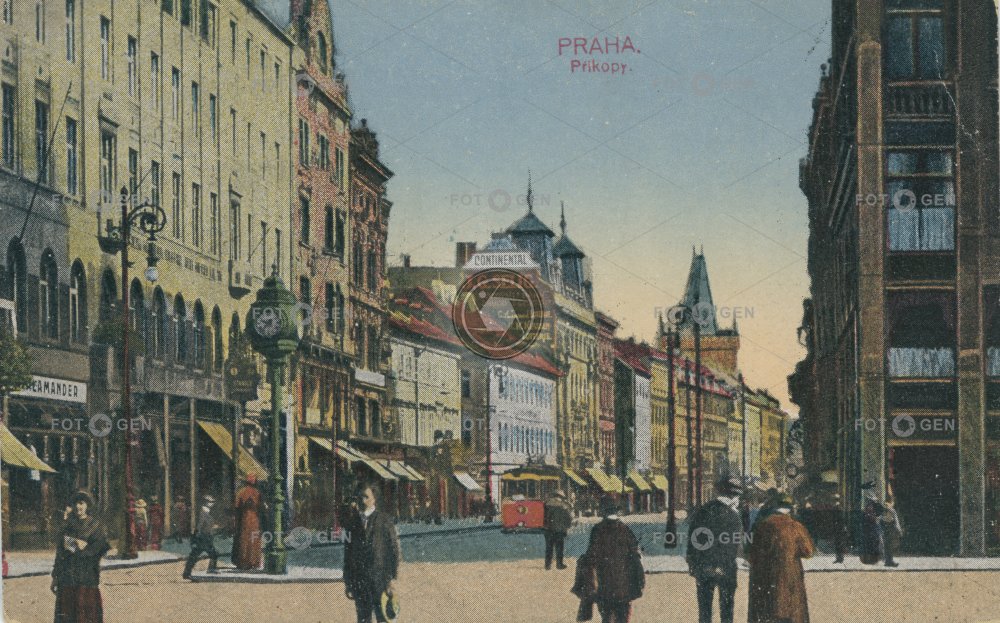 alive barevná colored Golden Cross místopis Na Příkopě pouliční hodiny pouliční osvětlení Prague Praha Příkopy street clock street lamp topography Václavák Václavské náměstí Wenceslas Square Zlatý kříž živá