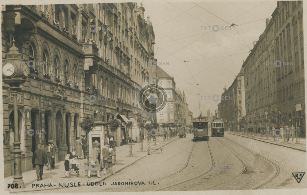 1930 alive hotel Union Jaromírova místopis Nusle Phone Booth pouliční hodiny Prague Praha Praha 4 street clock telefonní budka three-wheeler topography tram tramvaj tramvaj 4 tříkolka veřejný telefonní automat živá