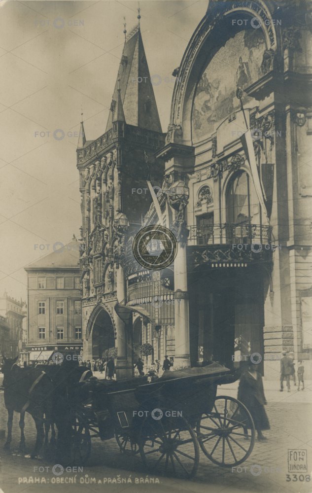 alive Antonín Balšánek Art Nouveau cab carriage drožka fiakr Gothic gotika kočár koňský povoz lamp lampa lighting místopis Municipal House Obecní dům Old Town Osvald Polívka osvětlení povoz Powder Tower Prague Praha Prašná brána secese Staré Město topography vehicle vůz živá