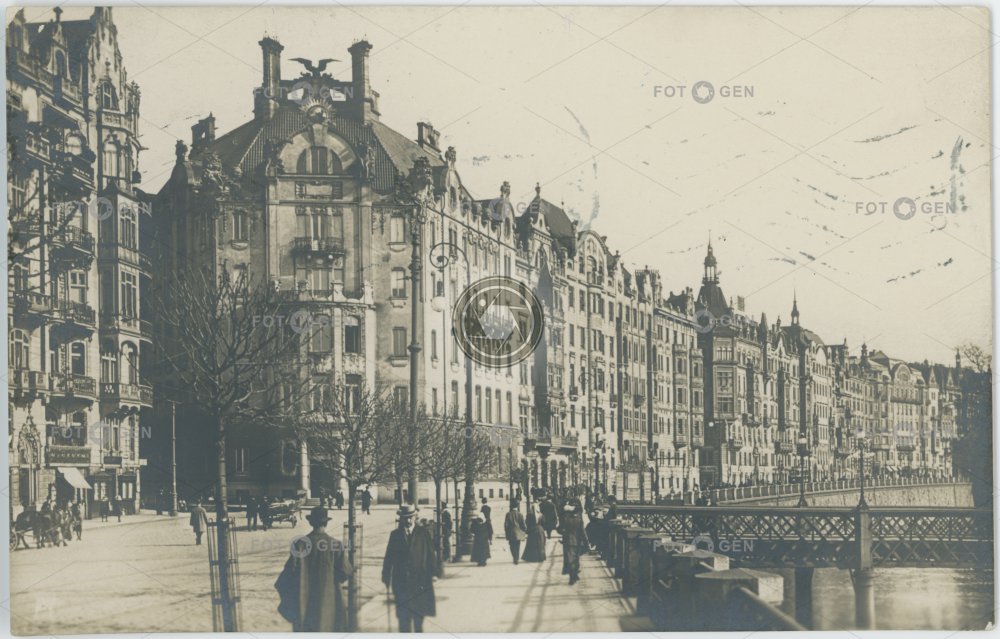 1914 alive Art Nouveau bank banka bridge embankment lávka Masarykovo nábřeží místopis můstek nábřeží pouliční lampa Prague Praha Riegrovo nábřeží secese securing street lamp topography urbanism urbanismus zajišťovací železný můstek živá Žofín