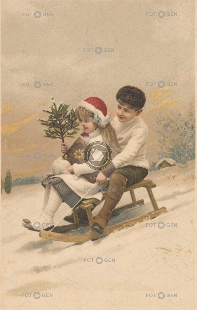carriage děti dítě Feiertage holidays child Christmas Christmas tree Kind kreslené leisure malované novoroční nový rok prvorepublikové přání sáňkování sáňky Schneeschlitten snow sled stromeček sváteční svátky vánoce vánoční volný čas Weihnachten Weihnachtsbaum