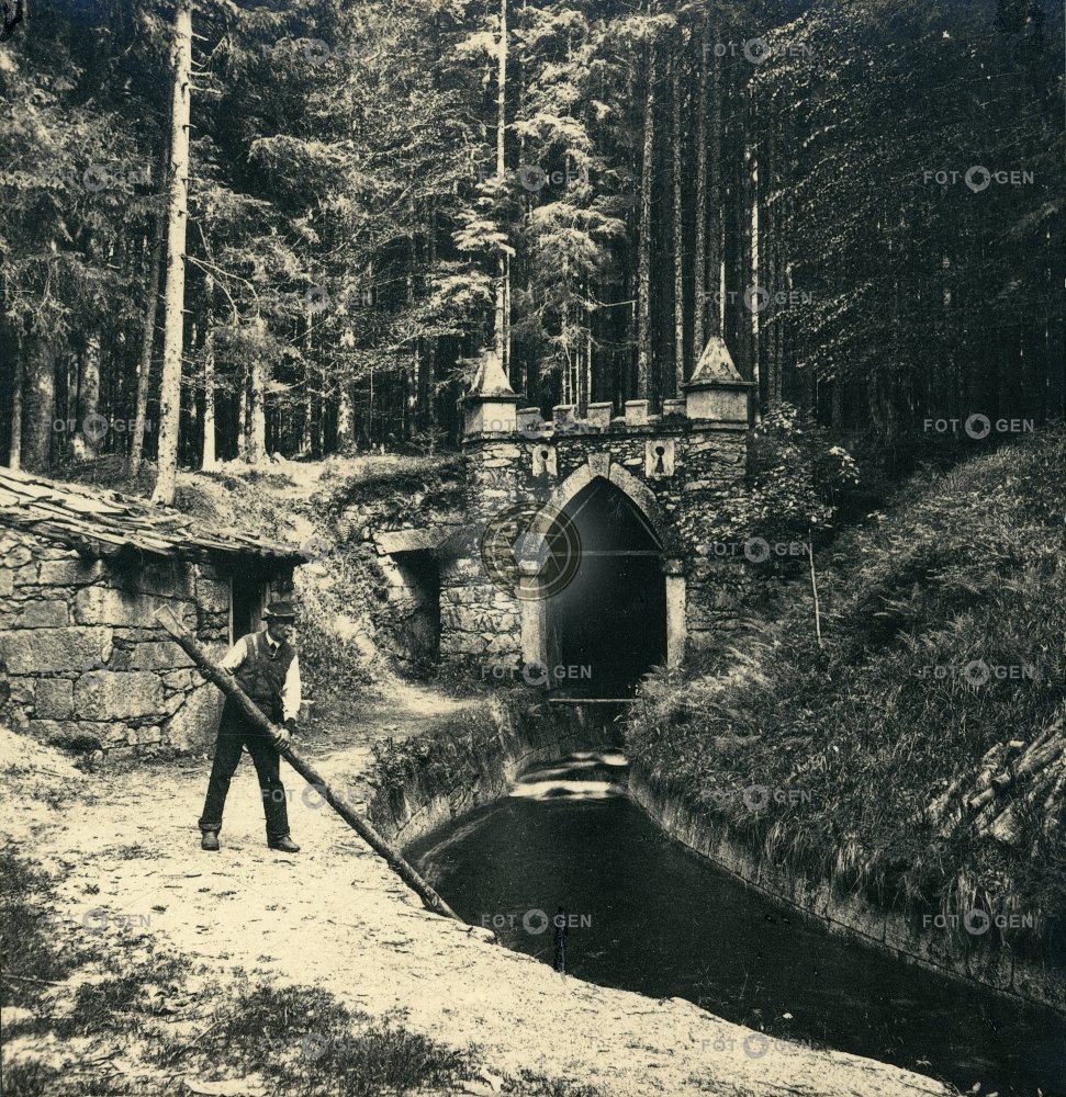bidlo Böhmerwald dřevař floating wood forest Horní portál Jelení Vrchy les lumberjack místopis navigation canal perch plavební kanál plavení dříví portál práce Schwarzenberg canal Schwarzenberský kanál Šumava topography tunel tunnel Upper portal voda water work