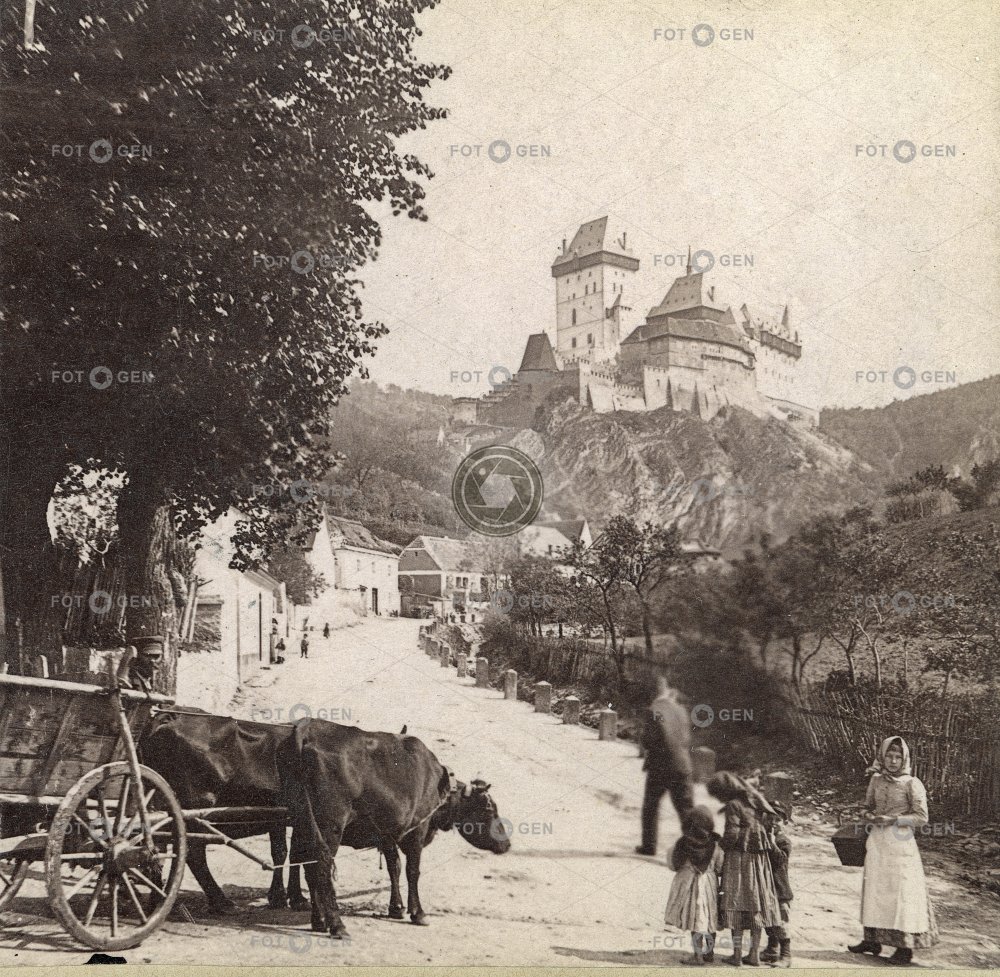 Hrad Karlštejn a ulice v podhradí, polovina stereofotografie
