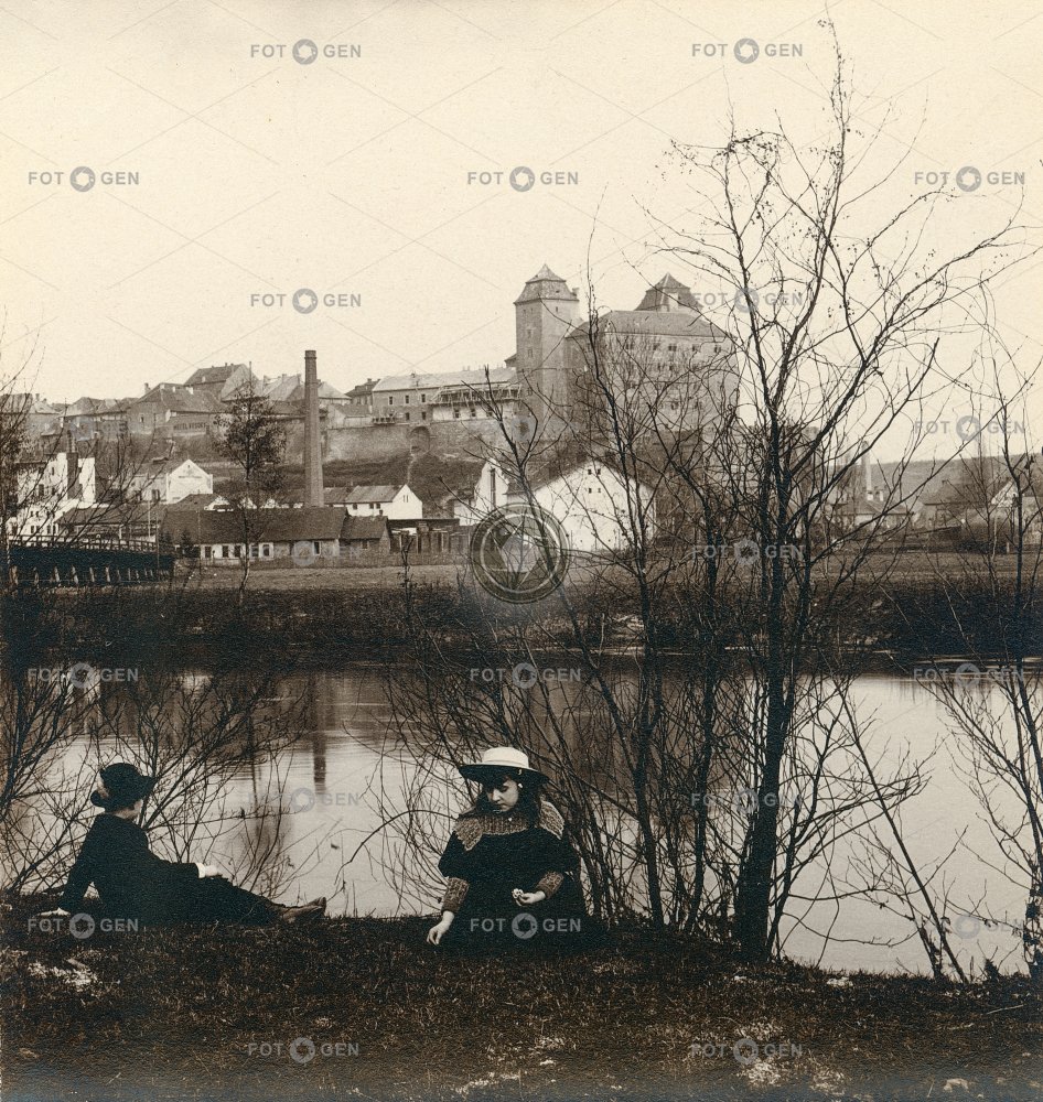castle celkový pohled děti factory flower picking general view hrad children chimney Jaro keř komín leisure místopis Mladá Boleslav river řeka shrub Spring topography továrna trhání květin volný čas