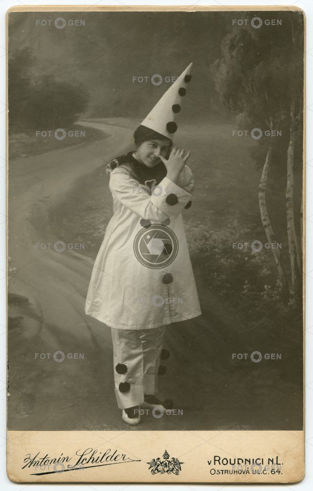 ateliér čepice dívka dlouhý nos entertainment ironie malované pozadí Pierot Portrait Pierot girl hat paint portrét zábava
