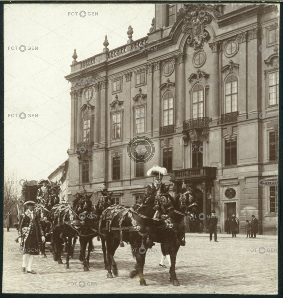 Arcibiskupský kočár Arcibiskupský palác Archbishop's carriage Archbishop's Palace carriage doprava horses Hradčanské náměstí Hradčany kočí koně livery livrej místopis Prague Praha topography transport
