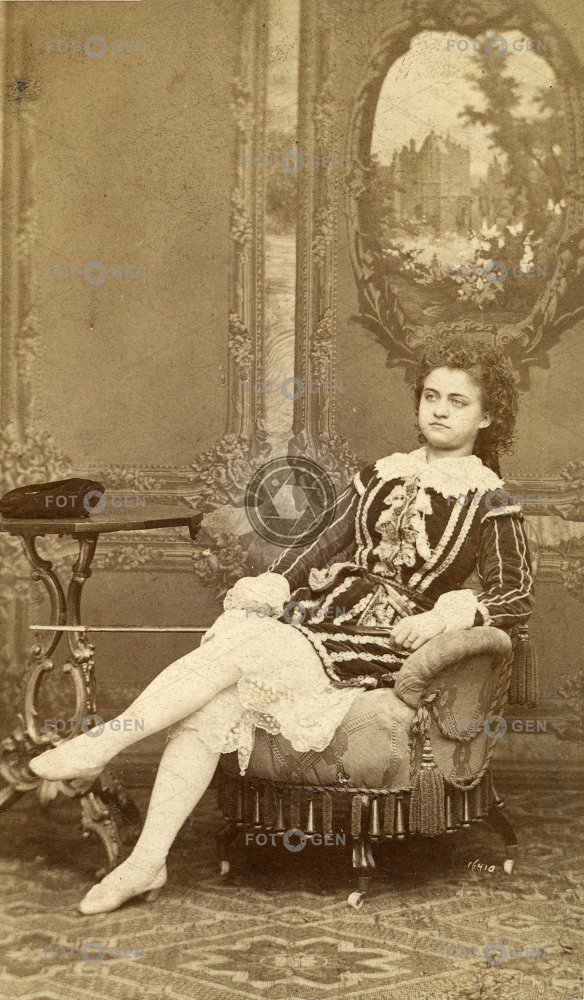 Portrét neznámé dívky (herečky?) v kostýmu v rokokovém interiéru , vizitka