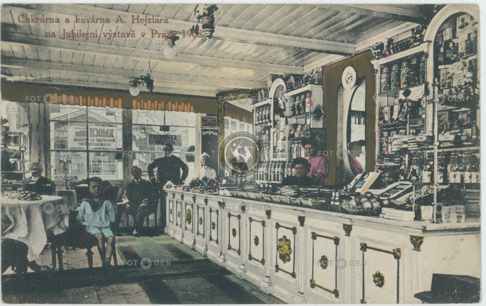 1908 A. Hejzlar alive barevná cafe color colored confectioner's confectionery cukrárna cukrářství děti dítě exhibition host hosté child interiér kavárna Kind kolorovaná lidé Menschen místopis people Prague Praha sweet-shop topography výstava zákazník živá
