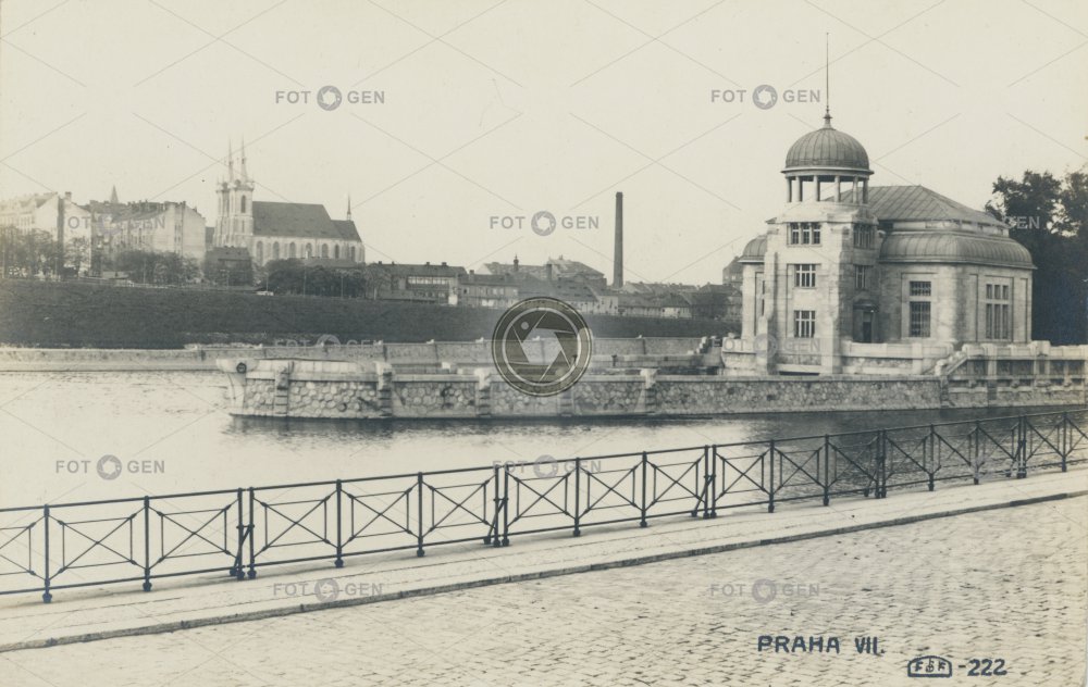 Holešovice hydroelectric power station chimney Church of St. Anthony of Padua Church of St. Anthony of Padua island island Štvanice komín Kostel sv. Antonína Paduánské místopis ostrov ostrov Štvanice Prague Praha Praha 7 Štvanice topography Vltava vodní elektrárna
