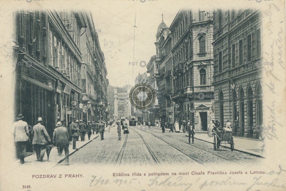 1905 alive barrow bridge dvoukolák Eliščina Františka Josefa I. Franze Josefa handcart chain bridge místopis most Neo-Renaissance Nové novorenesance Old Town pouliční ruch Prague Praha rozhraní ruční vozík řetězový most Staré Město street traffic topography živá