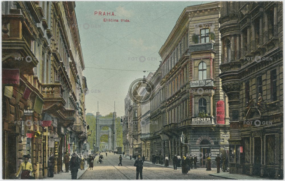 1910 barevná bridge Business School colored Eliščina Františka Josefa I. Franze Josefa kolorovaná místopis most obchodní škola Prague Praha Revoluční school škola topography trade school