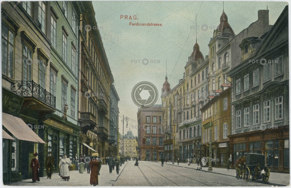 1909 alive barevná cab colored drožka Ferdinandova fiacres fiakr kolorovaná místopis Národní New Town Nové Město Old Town Prague Praha Staré Město street topography živá
