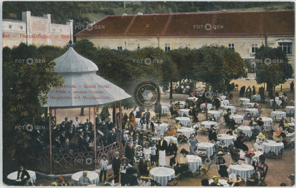 1925 alive altán altánek barevná color colored gazebo Grand hotel host hosté hudba hudebníci kolorovaná leisure letní místopis musician Musiker muzikant muzikanti Slovakia Slovensko summer-house topography Trencsénteplic Trenčianske Teplice Trentschin-Teplitz venkovní volný čas zahrádka zahradní zákazník živá