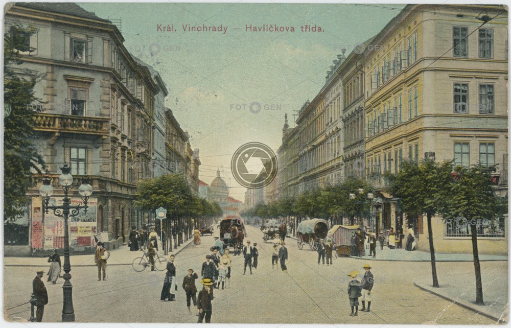 alive barevná Bělehradská bicykl colored cyclist cyklista Havlíčkova třída horse horse-drawn carriage kolorovaná koňský povoz Královské Vinohrady kůň místopis osvětlení pouliční osvětlení pouliční ruch povoz Prague Praha Royal Vineyard Royal Vineyards street lamp street traffic topography Vinohrady živá