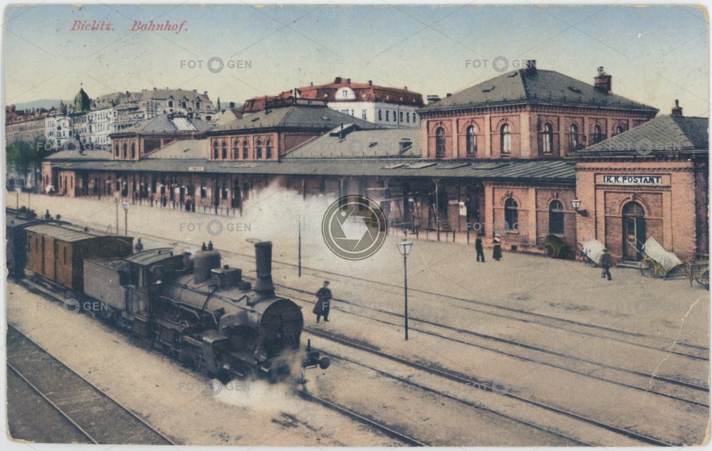 1916 barevná barrow Bielitz Bielsko Bílsko budova colored doprava dráha dvoukolák kolorovaná locomotive lokomotiva místopis nádraží nádražní parní lokomotiva Polish Polska Polsko railway station railway station building stanice steam steam locomotive tender tender lokomotiva tendr topography transport trať vlak vlaková zastávka známka železniční