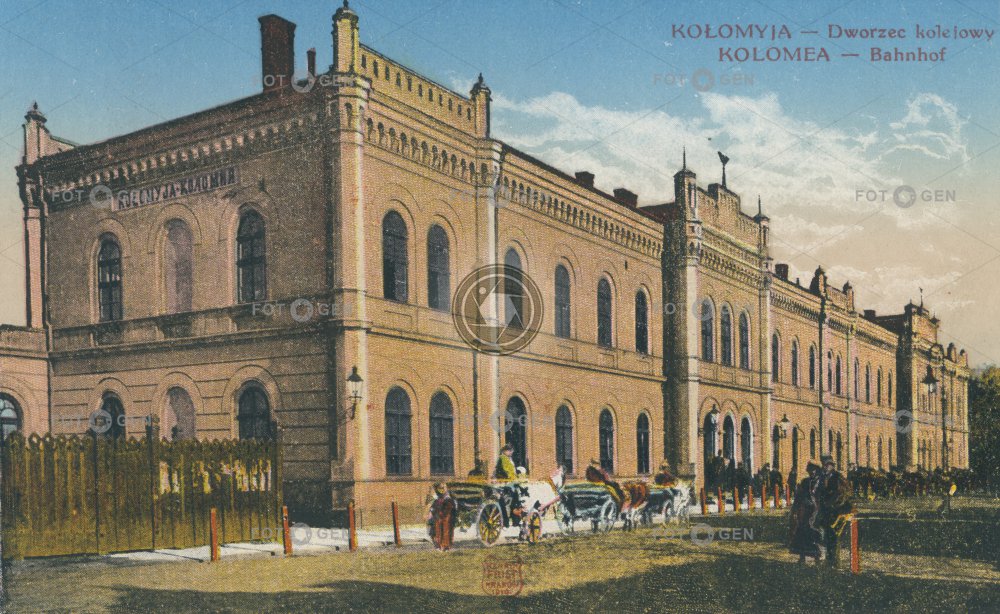 1916 barevná cab colored doprava dráha drožka kočár Kolomya kolorovaná koňský místopis nádraží railway station station topography transport trať Ukraine Ukrajina vlečka železniční
