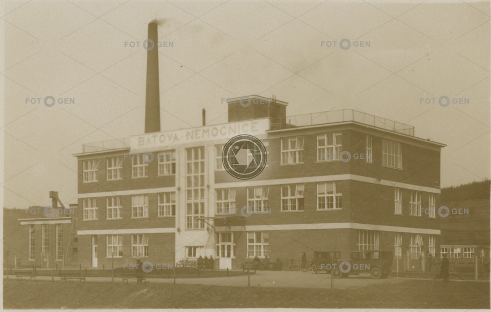 auto Baťa Hospital Baťova Baťova nemocnice budova car Gottwaldov hlavní hospital chimney KNTB komín místopis nemocnie Tomáše Bati topography vstupní Zlín