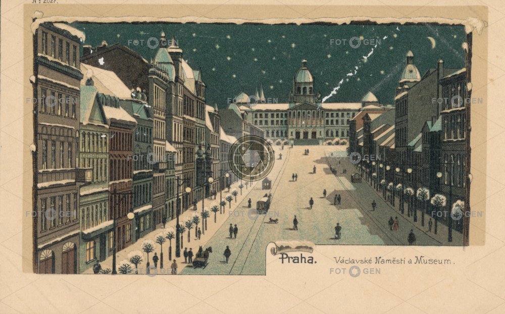 1898 art kresba malba místopis náměstí Národní muzeum National Museum New Town noc noční Nové Město Prague Praha sněží sníh snow square topography umění Václavák Václavské Wenceslas Wenceslas Square winter zima