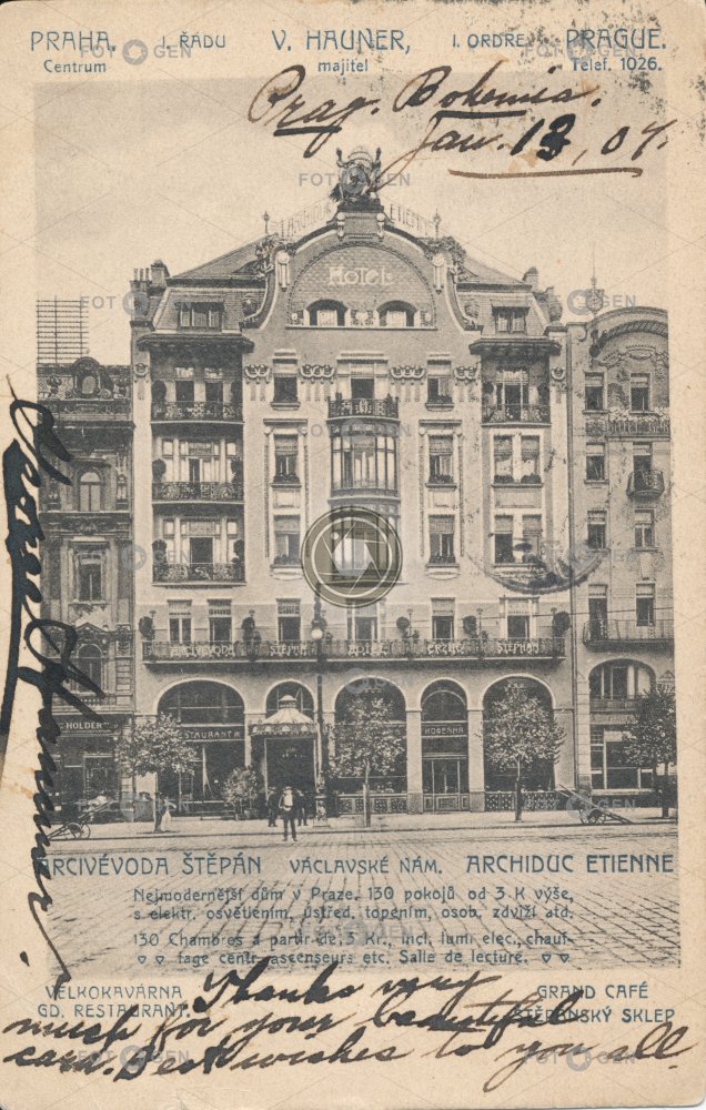 1907 Arcivévoda Štěpán Evropa Grand hotel Grand hotel Evropa hospoda hotel místopis náměstí New Town Nové Město Prague Praha restaurace secese secesní square topography Václavák Václavské Wenceslas Wenceslas Square