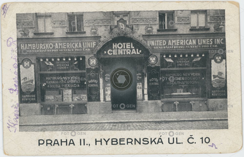 American Shipping and Commerci Art Nouveau Central Červená sedma Hambursko-Americká linie hotel Hybernská lodní společnost místopis New Town Nové Město Ohmann Prague Praha přepravní společnost secese secesní topography transportation company ulice United American Lines