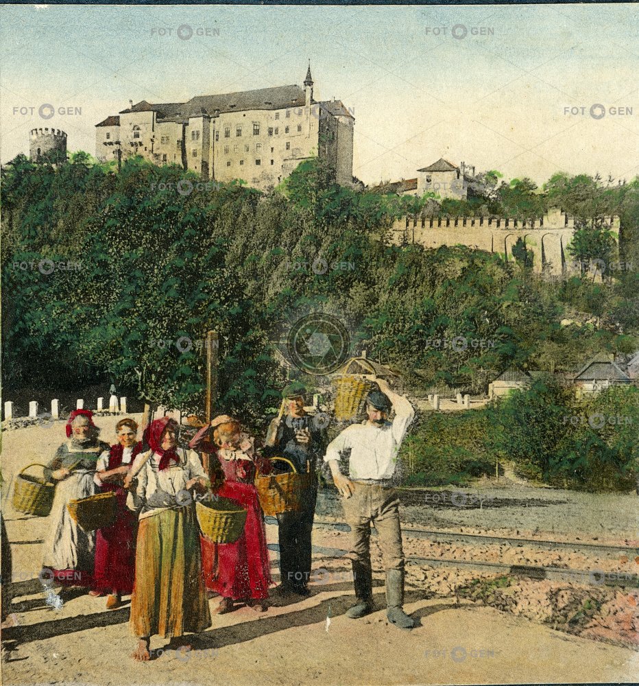 castle clothing coloring costumes Český Šternberk ethnology etnologie group hrad kolorování kroje market místopis oděv river řeka Sázava skupina topography trh women ženy