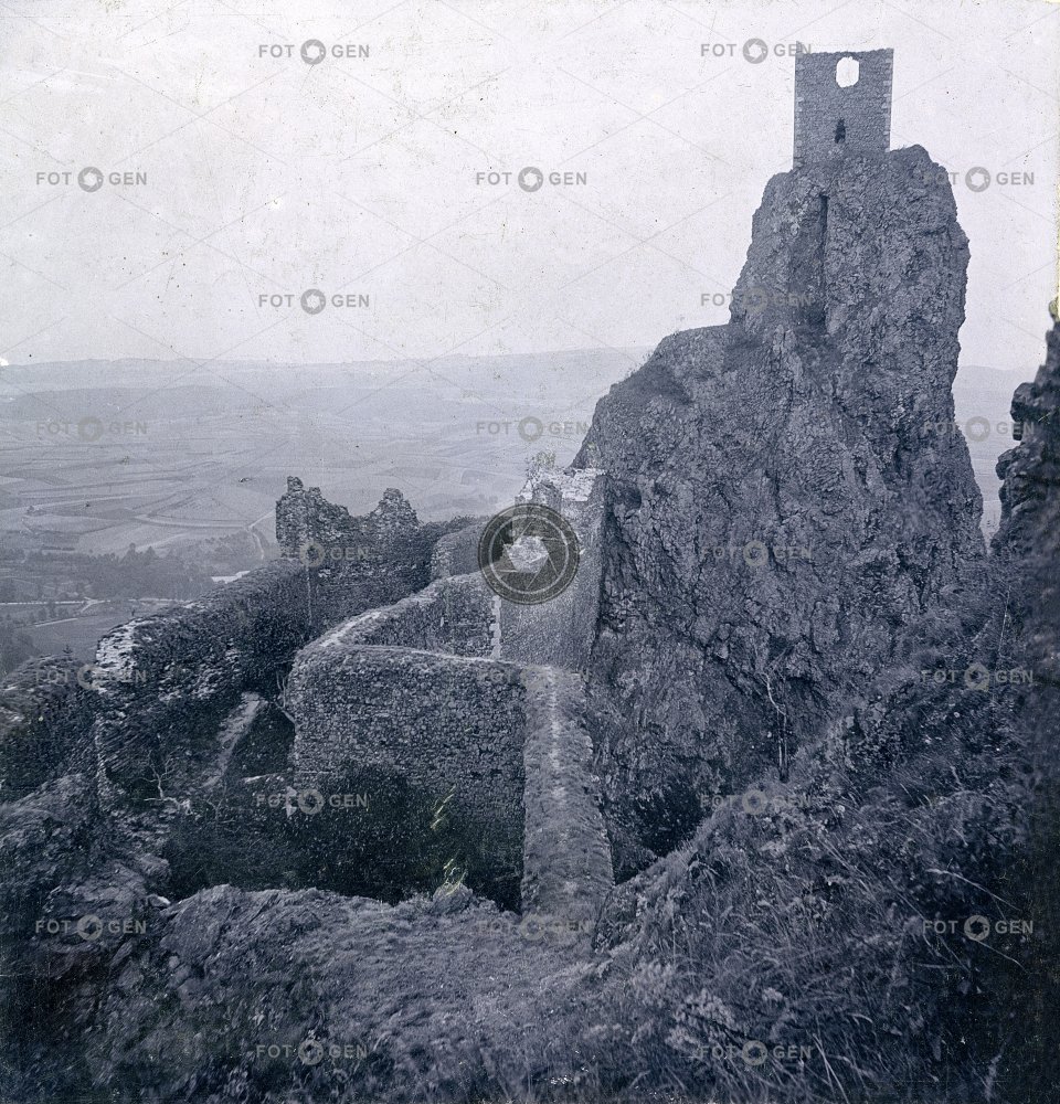 Hrad Trosky vnitřní prostor, věž Panna, polovina stereofotografie (na reversu text o odvážlivci Zemanovi, který vrchol slézá za odměnu 10-20 krejcarů)