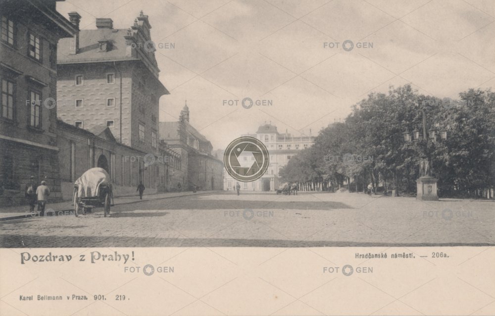 horse carriage Hradčanské Hradčany kandelábr Karel Bellmann koňská vlečka kostel sv. Benedikta lamppost místopis náměstí palác palace povoz Prague Praha Salmovský Schwarzenberský square topography