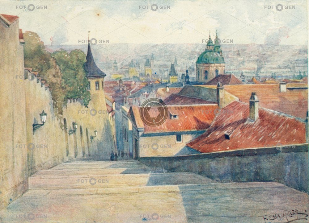 akvarel art barevná castle Steps colored Ferdinand Engelmüller Hradčany Charles Staircase kresba Lesser Town Malá Strana malba místopis Nové zámecké schody obraz old panorama Picture Prag Prague Praha schodiště stará staré topography umění Watercolor painting Zámecké schody