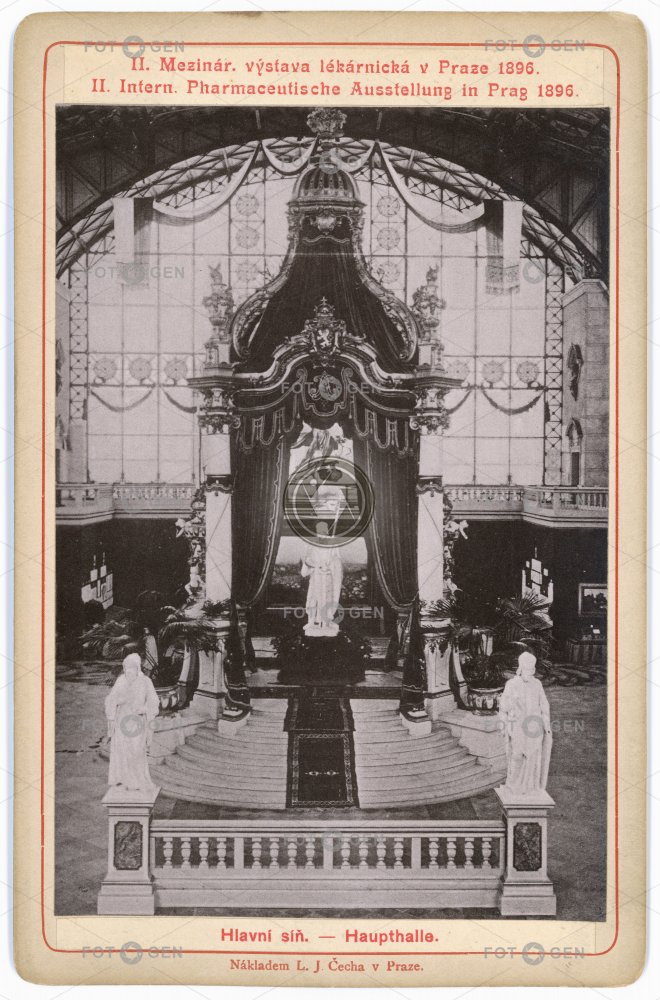 baldachýn canopy Czech Lion český lev exhibition Industrial Palace interiér interior Lékárnická místopis Pharmacy Prague Praha Průmyslový palác socha stained glass statue topography vitráž výstava