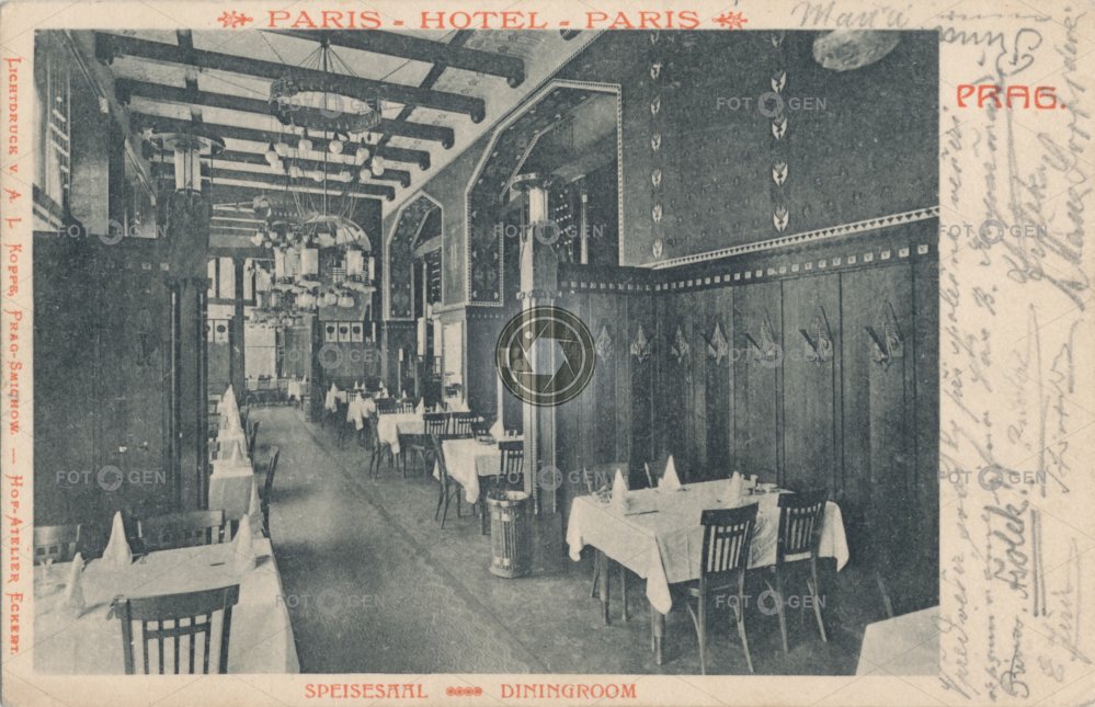 1905 brasserie dining room guesthouse hospoda hostinec hotel hotel Paříž chair chandelier interiér interior jídelna lighting lustr místopis Obecní dům Old Town osvětlení Paris Paříž pivnice Prag Prague Praha pub restaurace restaurant seat Staré Město stoly stůl table topography U Obecního domu židle