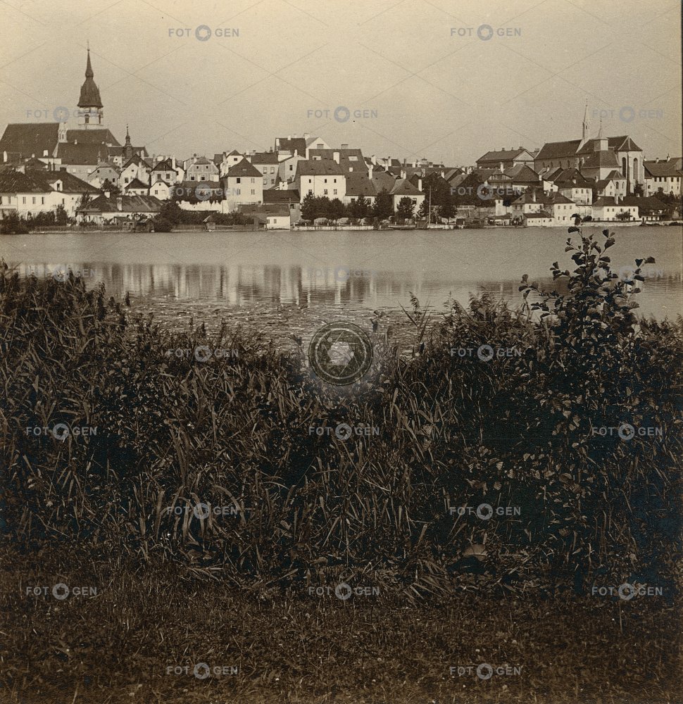 břeh church Jindřichův Hradec kostel místopis nature panorama pond příroda rákosí reeds rybník shore silhouette of the city silueta města topography Vajgar