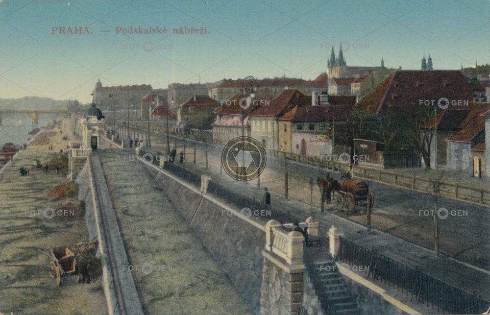 barevná colored Emauzy embankment kolorovaná místopis nábřeží neexistující stavba nonexistent building Podskalí Podskalské Prague Praha Rašínovo topography výstavba