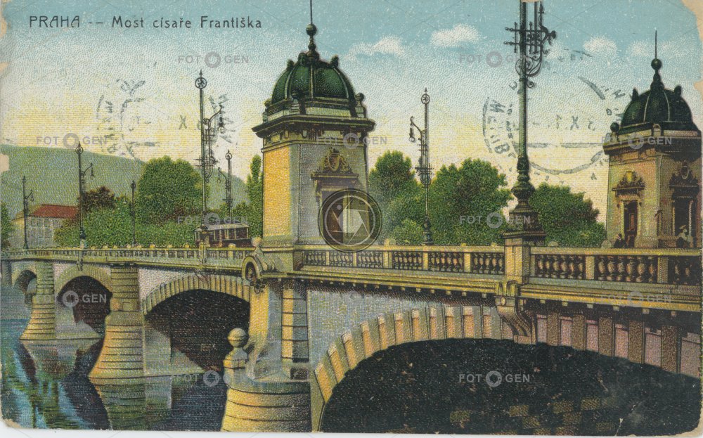 1911 barevná bridge budka císaře Františka color colored kolorovaná Legií místopis most mostné Old Town Prague Praha Staré Město topography výběrčí
