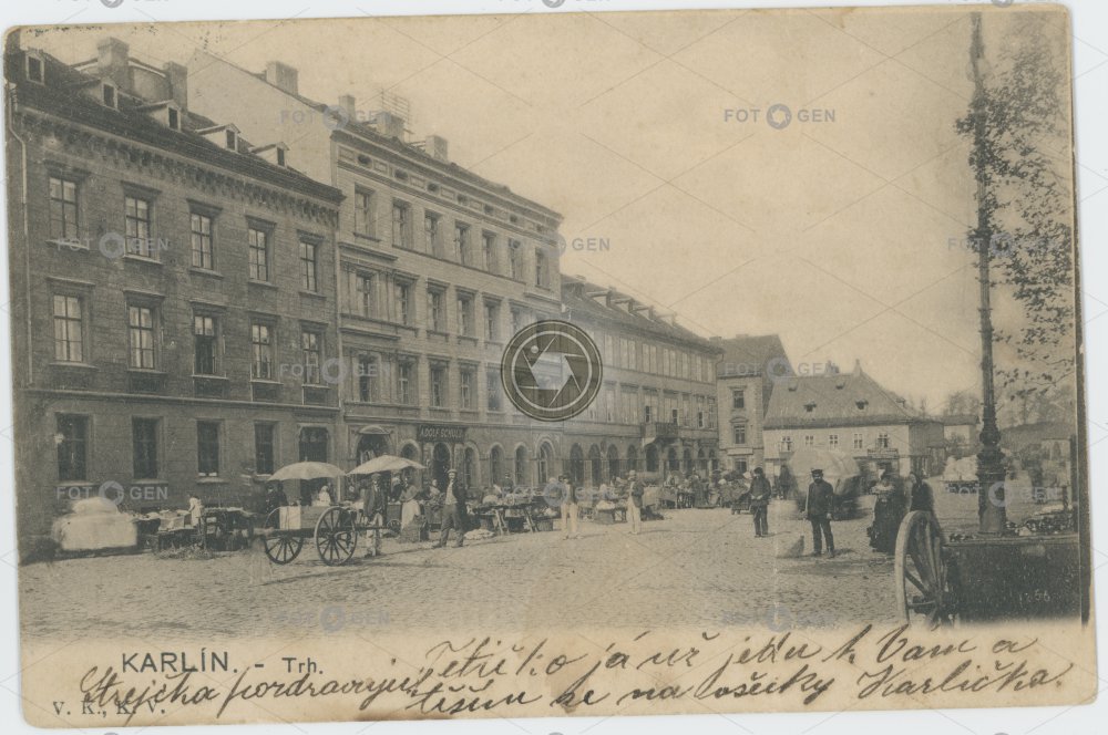 1908 alive barrow dvoukolák Jungmannovo náměstí Karlín Karlínské náměstí market market place místopis parasol Prague Praha Praha 8 slunečník square topography trh tržiště tržnice živá