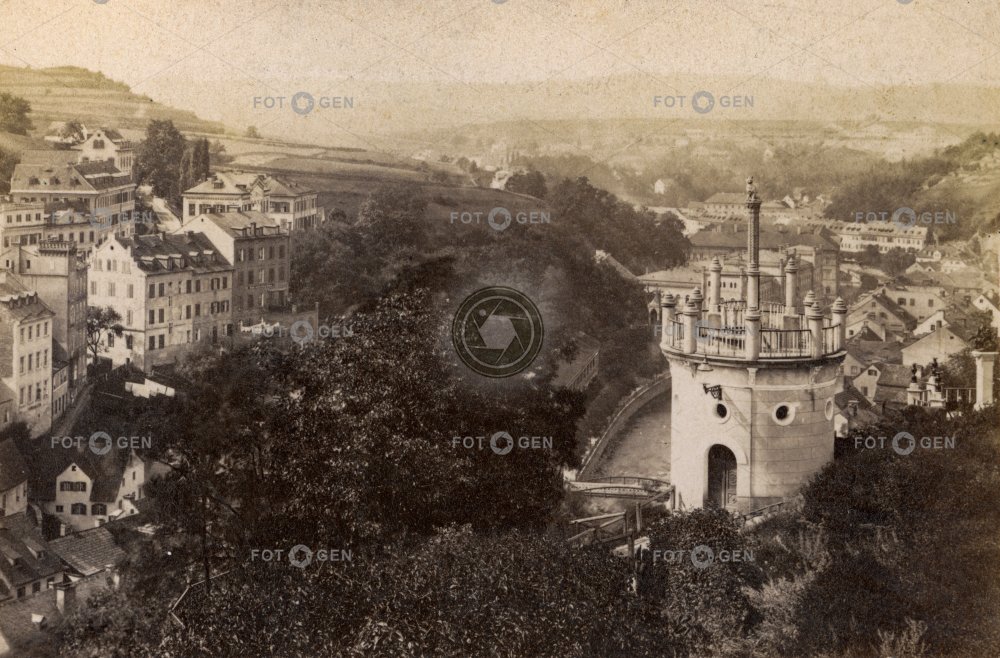 bird's eye view cat column garden Karlovy Vary Karlsbad kočka lázně místopis panorama ptačí perspektiva sloup spa topography tower věž vila Lützow Villa Lützow zahrada