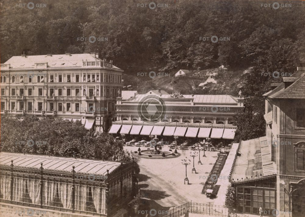 cafe fountain garden hotel Karlovy Vary Karlsbad kašna kavárna lamps lampy lázně místopis Pupp spa topography zahrada