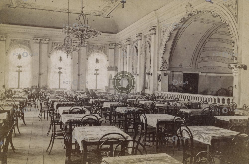 cafe chandelier Karlovy Vary Karlsbad kavárna lázně leisure lustr místopis pódium Pupp spa stoly stucco štuk tables Thonet chair topography volný čas židle Thonet