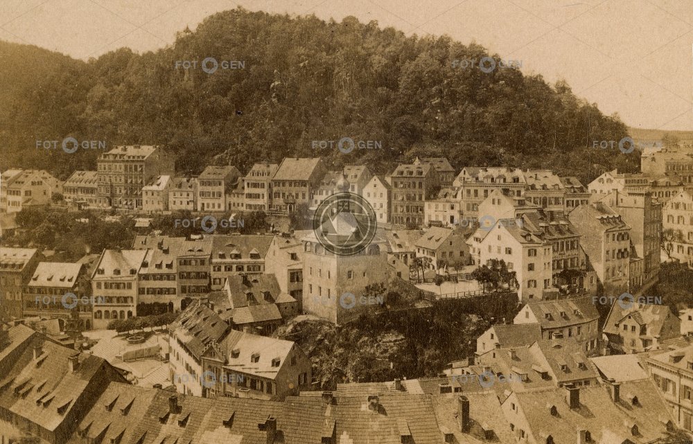 bird's eye view Castle Tower Karlovy Vary Karlsbad lázně Market Square místopis panorama ptačí perspektiva spa topography Tržní náměstí Zámecká věž