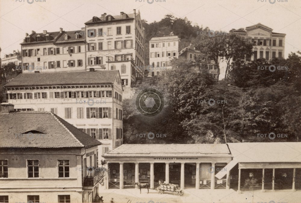 bird's eye view Castle hilll empír empire Karlovy Vary Karlsbad lázně Mill Colonnade minerální voda místopis Mlýnská kolonáda ptačí perspektiva spa street topography ulice vineral water vůz Zámecký vrch
