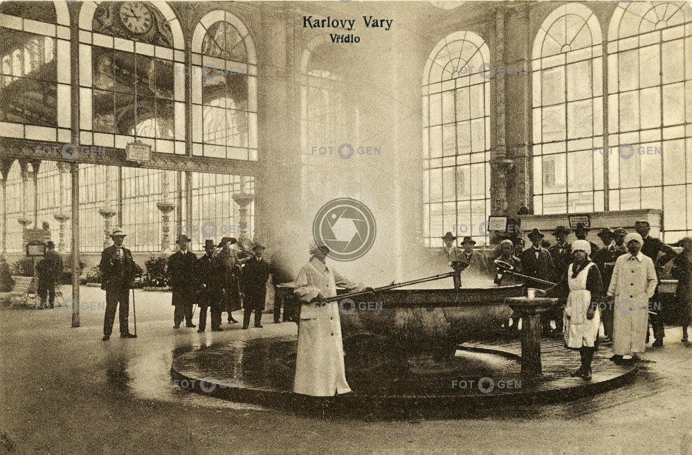 colonnade Hot spring hot spring girls interiér interior jímání vody Karlovy Vary Karlsbad kolonáda lázeňští hosté lázně místopis práce spa spa guests taking up mineral water topography vřídelní dívky Vřídlo work